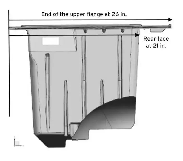 The upper flange, which carries the perimeter seals for the front and rear covers, extends back 26 in., but occupies only a small area at the top of the box